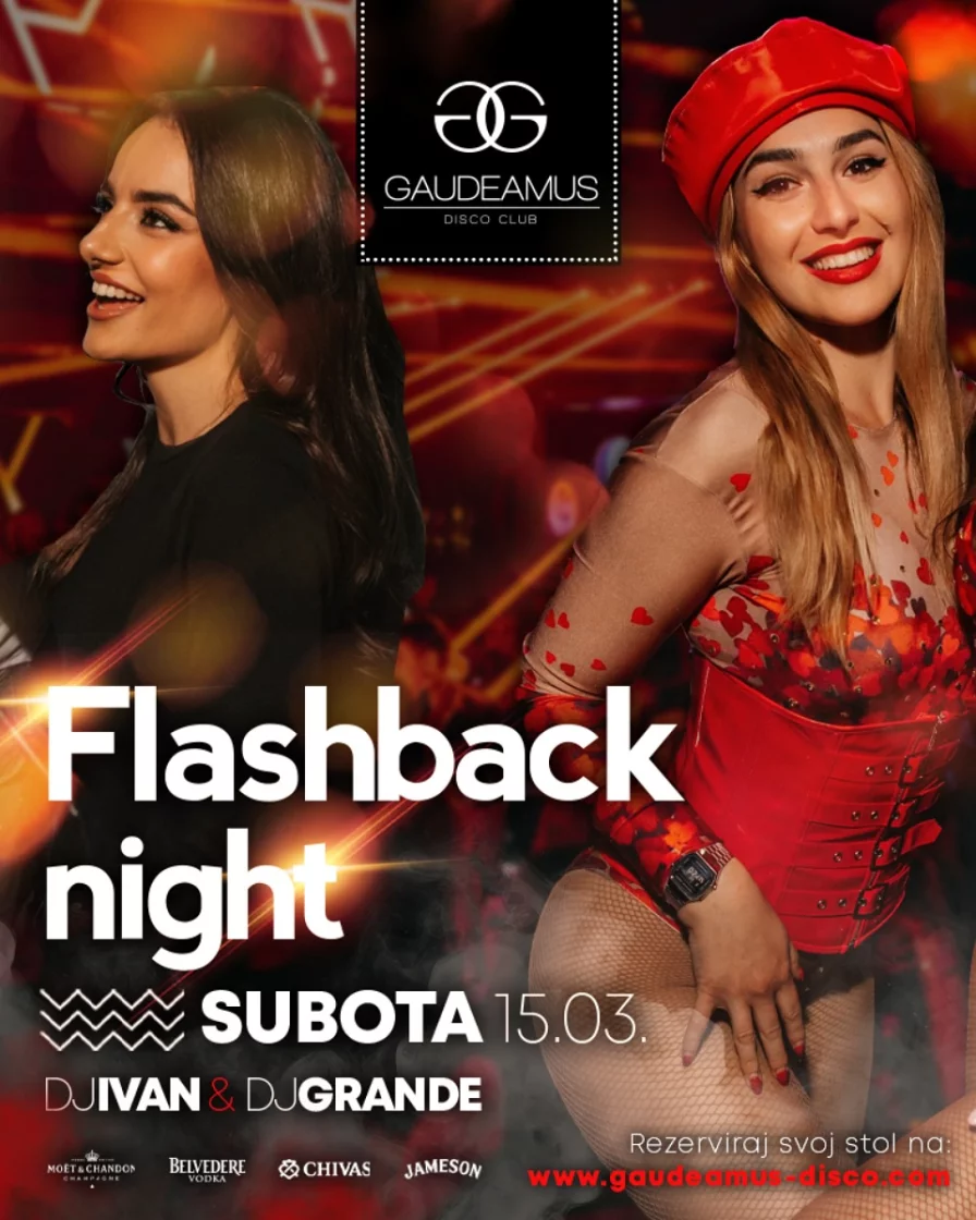 🎧 Večer započinjemo uz najnovije hitove koji haraju plesnim podijima, a kako noć odmiče, putujemo unatrag kroz vrijeme uz legendarne pjesme koje su obilježile generacije. Bilo da ste zaljubljenik u retro klasike ili ne možete odoljeti modernim ritmovima, Flashback Night je party koji ne smijete propustiti! 🕺💃